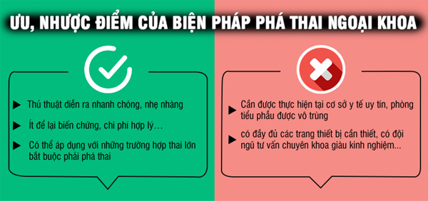 Phương pháp phá thai ngoại khoa: Dùng các dụng cụ y tế (dụng cụ hút chân không bằng tay) can thiệp vào cổ tử cung của chị em để chấm dứt thai nghén. Phương pháp này chỉ an toàn khi người cung cấp dịch vụ là những cán bộ y tế đã được đào tạo bài bản và có đủ kỹ năng thực hiện thủ thuật tại cơ sở y tế với đầy đủ phương tiện